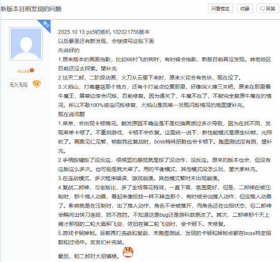 贴吧玩家“Asura”日前发帖,表示自己用PS5初版机型游玩《黑神话:悟空》PS5版的新版本时发现了一些性能与Bug问题,例如游戏菜单会出现卡顿的情况、手柄按键按了没反应、连战模式下出现游戏崩溃的情况以及在Boss特定招数和过场中出现卡顿与掉帧的情况等。好消息是,《黑神话:悟空》PS5版的新版本修复了一些画面问题,例如拖影以及闪烁等。